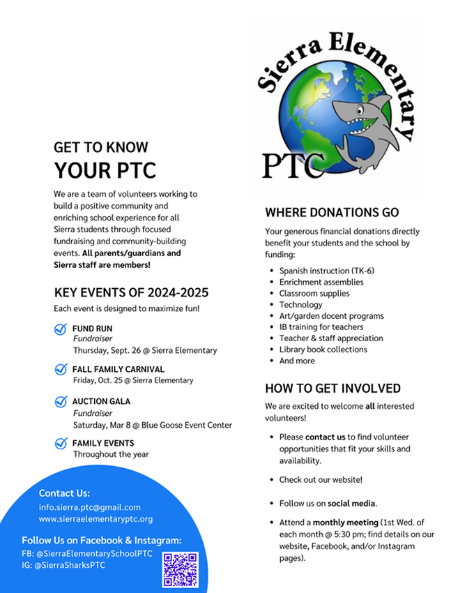 Volunteering: There are many ways for you to be involved in the Sierra community and the PTC from planning, volunteering for, or donating to an event to attending one of our monthly meetings. Visit the volunteer page or email us at info.sierra.ptc@gmail.com for more information.